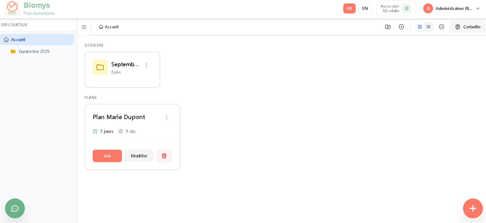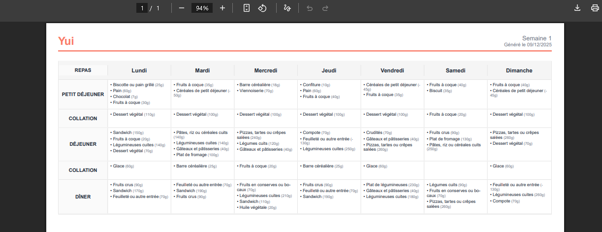 En un clic, le système génère 7 jours de menus complets.